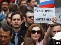 Miles de personas se concentraron hoy en la céntrica avenida Sájarov de Moscú en una protesta contra el bloqueo del servicio de mensajería por internet Telegram, prohibido por decisión judicial tras negarse a entregar a las autoridades rusas las claves para descifrar sus mensajes.